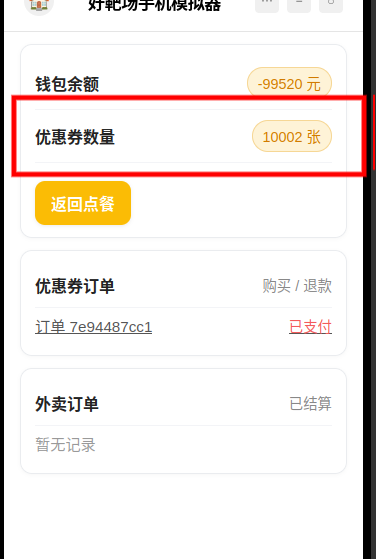 攻击逻辑:个人优惠卷数量  = 原数量 -退货数量(退货数量为负)= 原库存 +退货数量,导致个人优惠卷数量增加